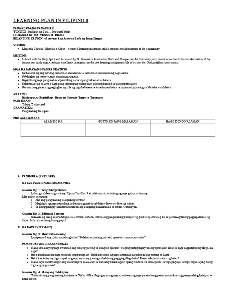 Banghay Aralin 30 Docx Banghay Aralin Sa Filipino Vi Panitikan I Layunin A Nakikilala Ang Mga Salitang Pamilyar At Di Pamilyar B Naisasabuhay Ang Course Hero