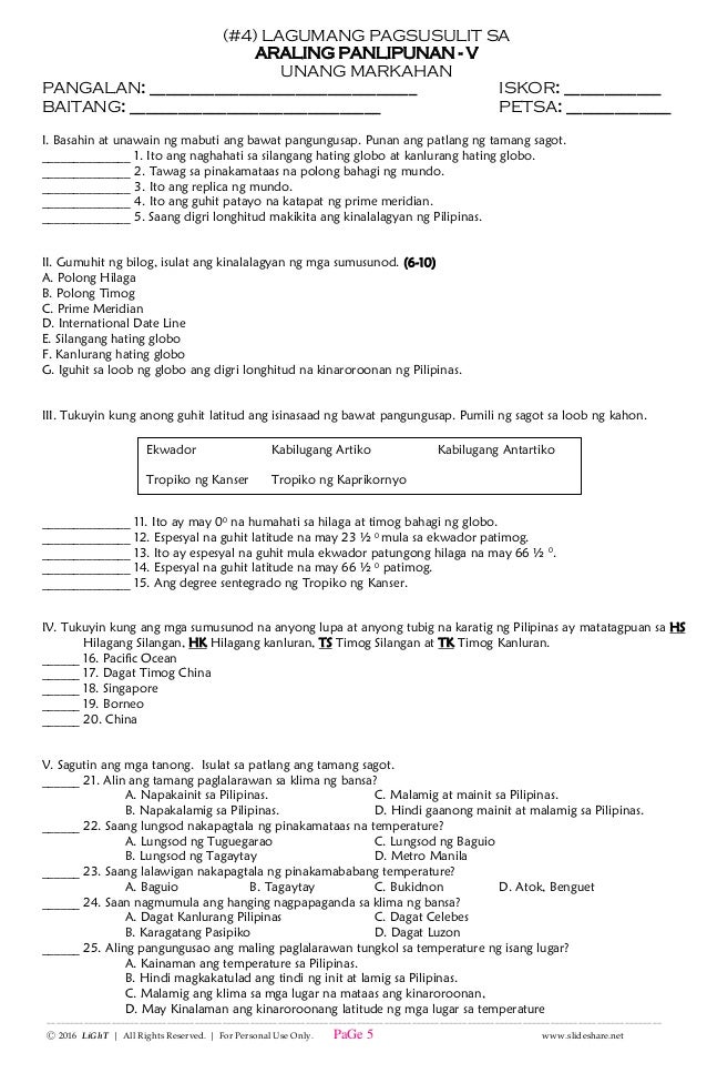 K To 12 Grade 5 Unang Lagumang Pagsusulit
