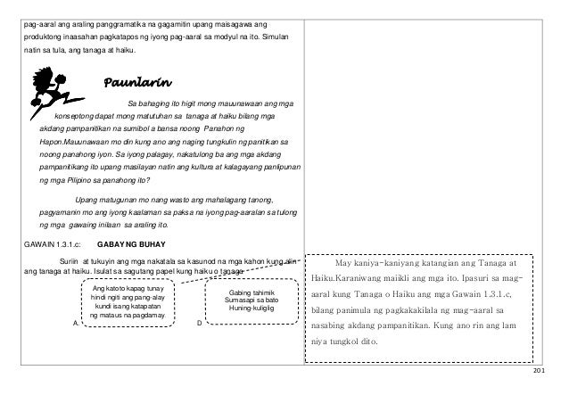 Night quietly joining the stone sound of cricket. Ipaalala rin na ang Tanaga at Haiku ang unang aralin sa modyul na ito. Gabing tahimik sumasapi sa bato huning kuliglig.